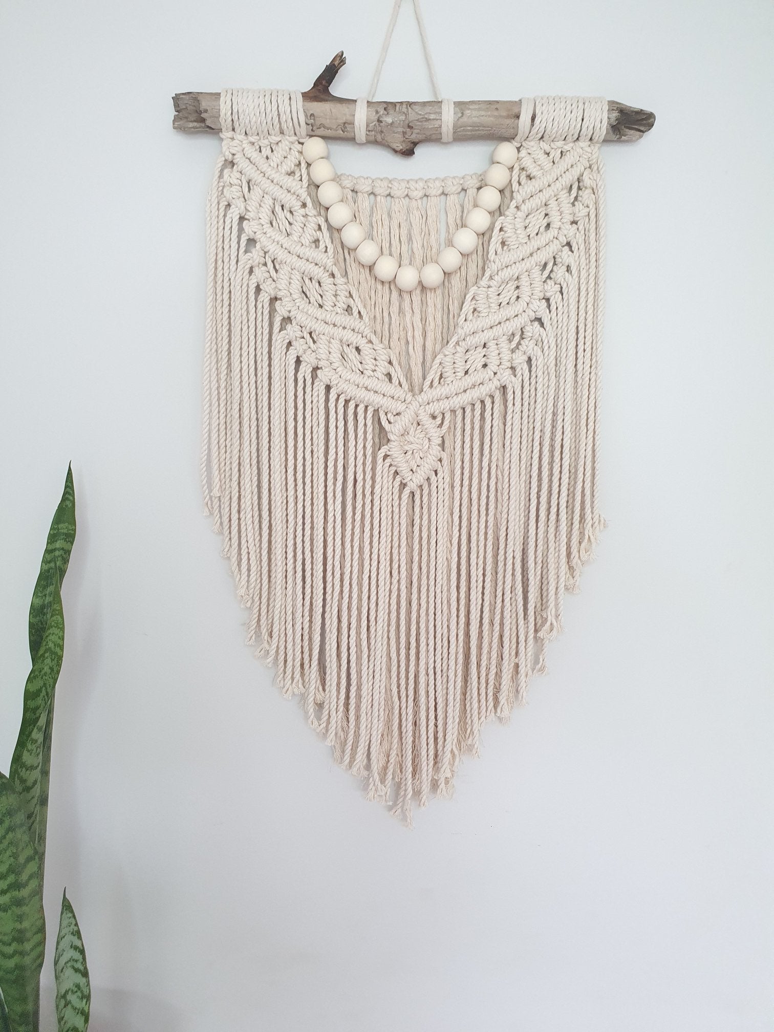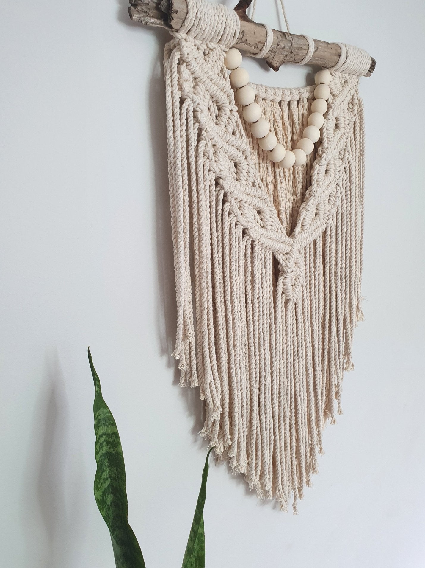Isla is made from 4mm 4ply natural cotton cord and is made on drift wood found on the beaches of Auckland, NZ with natural wood beads.